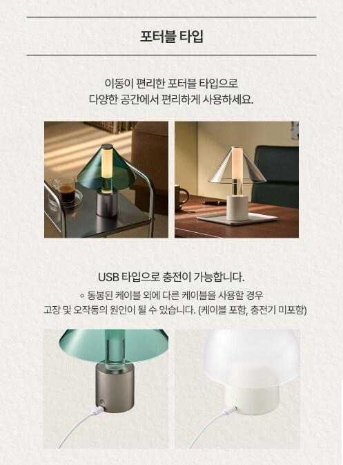 올해 처음으로 선보이는 포터블 램프 4종류입니다. USB로 충전하여 이동이 편리한 포터블 타입의 램프로 다양한 공간에서 편리하게 사용할 수 있습니다.