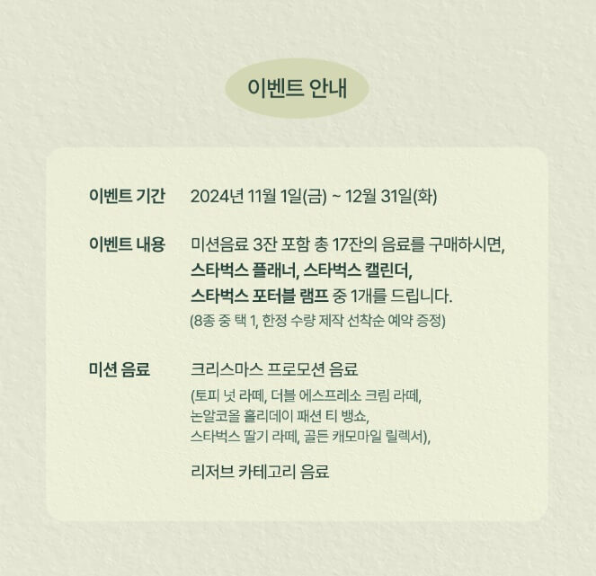 스타벅스 프리퀀시의 시즌이 돌아왔습니다. 이번 행사는 2024월 11월 1일부터 12월 31일까지 진행하고 미션음료 3잔을 포함하여 총 17잔의 음료를 구매하면 굿즈 8종류 중 원하는 것을 받을 수 있습니다. 선착순 행사이므로 뒤로 갈수록 증정품이 품절될 수도 있으니 서둘러 스티커를 모아 원하는 굿즈를 얻으시기 바랍니다.