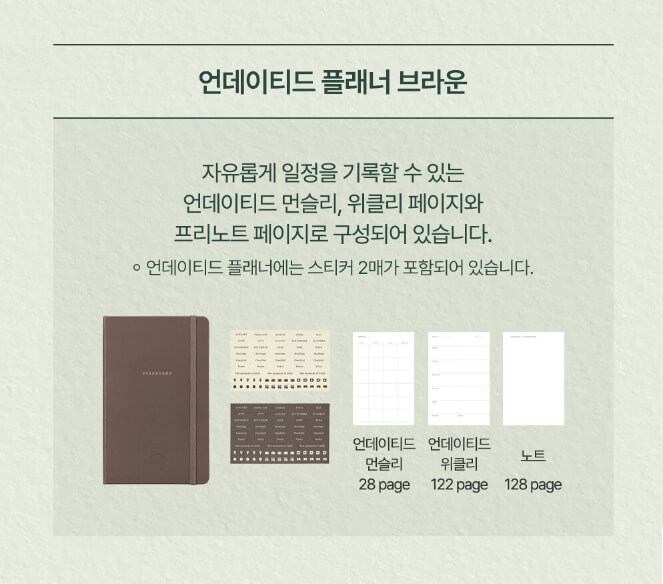 그린과 핑크색 플래너는 데일리 플래너로 먼슬리, 데일리, 노트로 구성이 되어있고, 브라운 플래너는 언데이티드 플래너로 날짜가 적혀있지 않고 스티커 2장이 포함되어 있습니다.